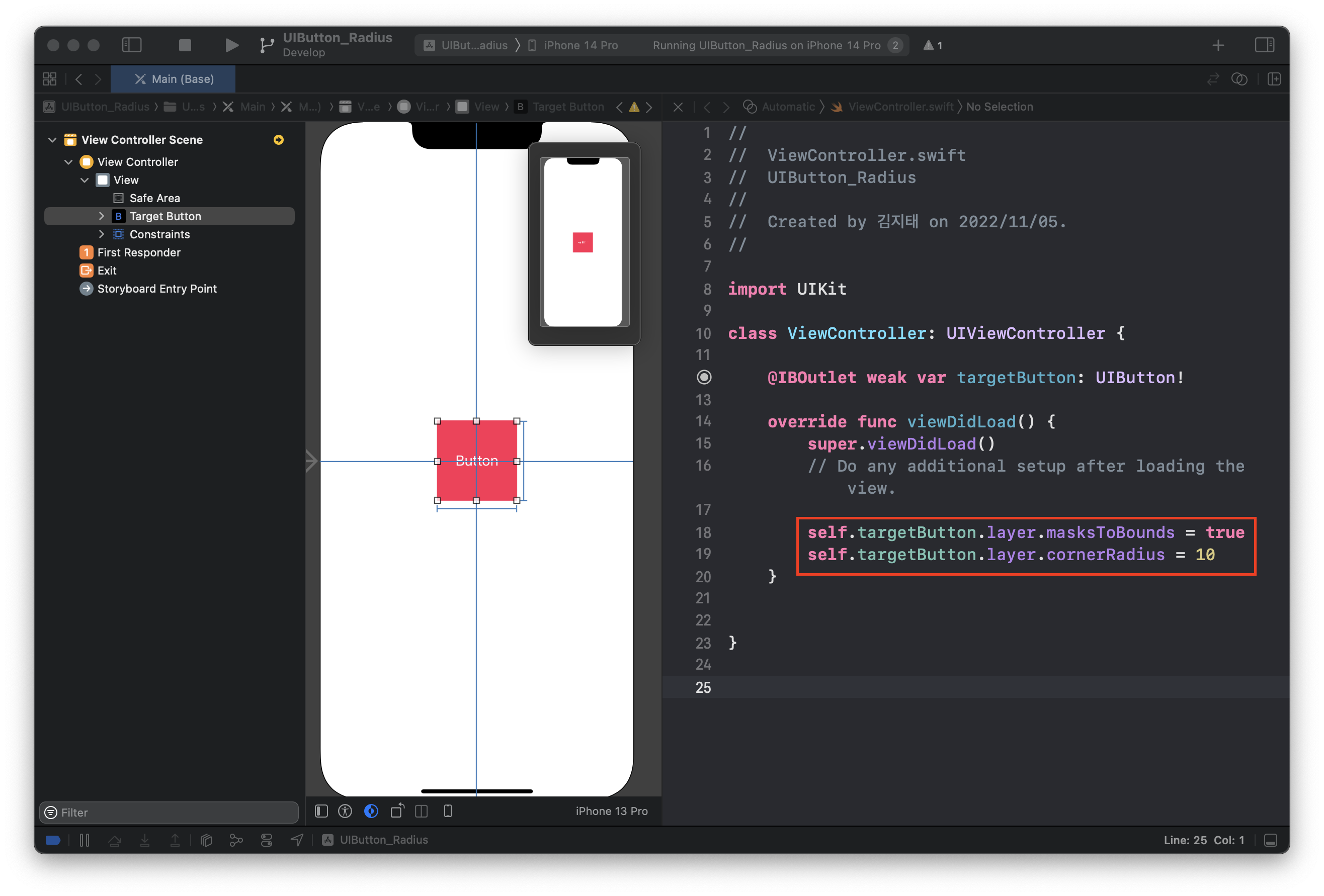 [iOS/Swift] UIButton 모서리 둥글게 설정하기 / 코너 corner radius Storyboard 활용