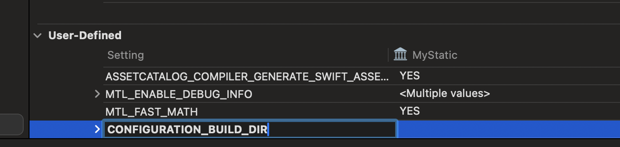 메뉴를 선택하면 사진 처럼 'User-Defined' 옵션칸에 새로운 setting이 추가됩니다. 저는 'CONFIGURATION_BUILD_DIR'를 추가하였습니다.