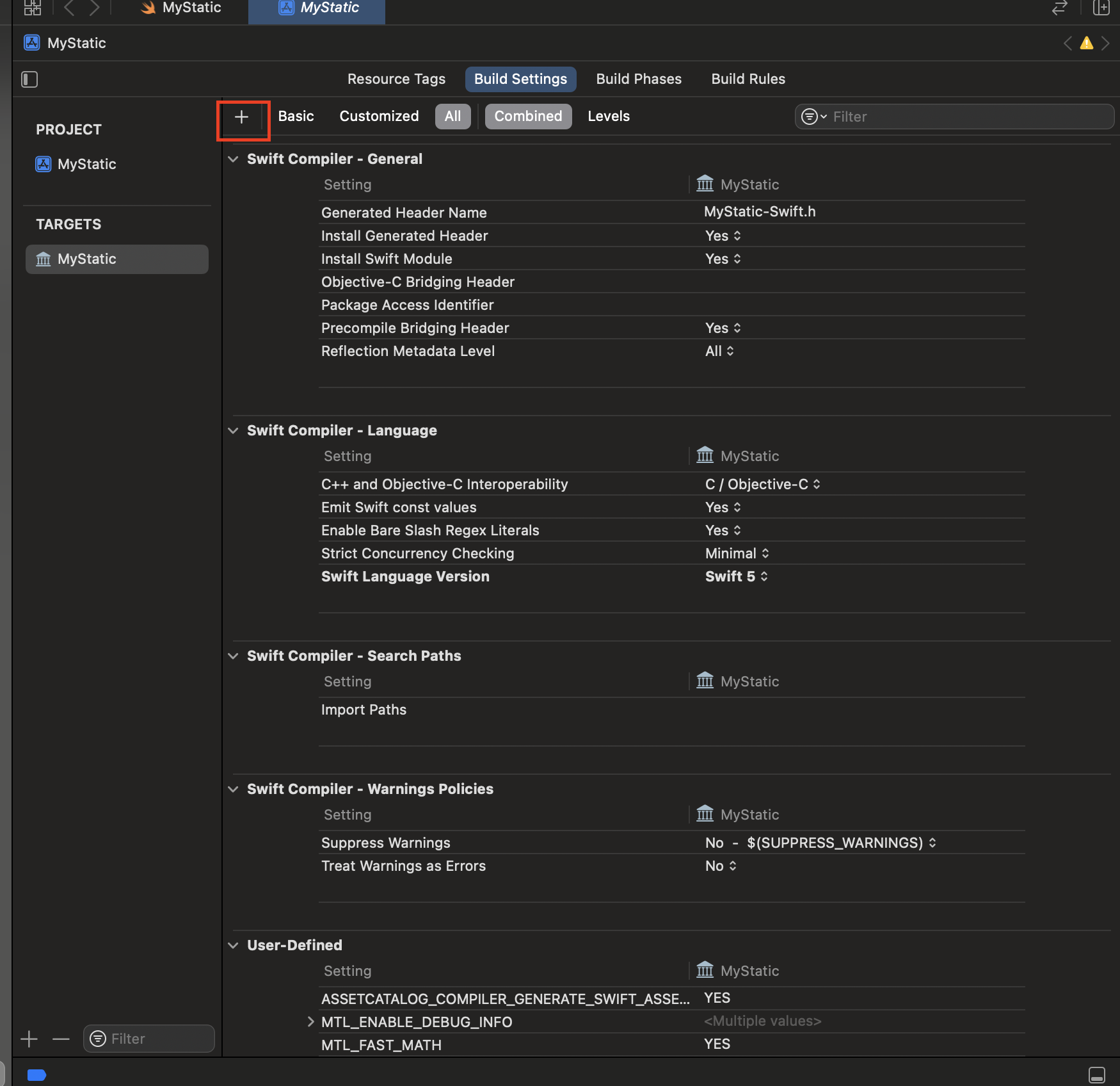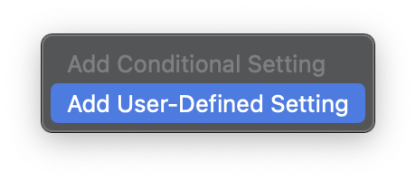 원하는 타겟을 선택하고 Build Setting으로 이동하고 상단에 위치한 '+'를 눌러줍니다.