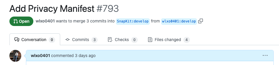 Privacy Manifest를 필수 적용해야하는 대상들 중 하나는 SnapKit이다. 근데 이 라이브러리 마지막 업데이트는 2022년 4월이다. 인기 많은 라이브러리 치고는 2023년에 업데이트가 하나도 없다는 점이 아쉬운 부분이다. Privacy Manifest를 추가하기 위해서는 새로 릴리즈가 되어야하는 점도있어서 지켜봐야한다.