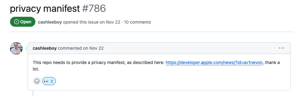 11월달에 스냅킷 이슈에 Privacy Manifest 관련해서 글이 올라왔으나 아직까지는 반응이 없다.