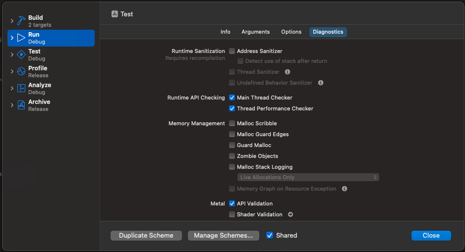 Edit Scheme -> Run -> Diagnostics로 이동합니다.