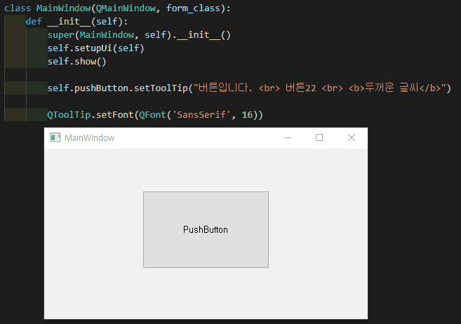 self.pushButton.setToolTip("버튼입니다. <br> 버튼22 <br> <b>두꺼운 글씨</b>")